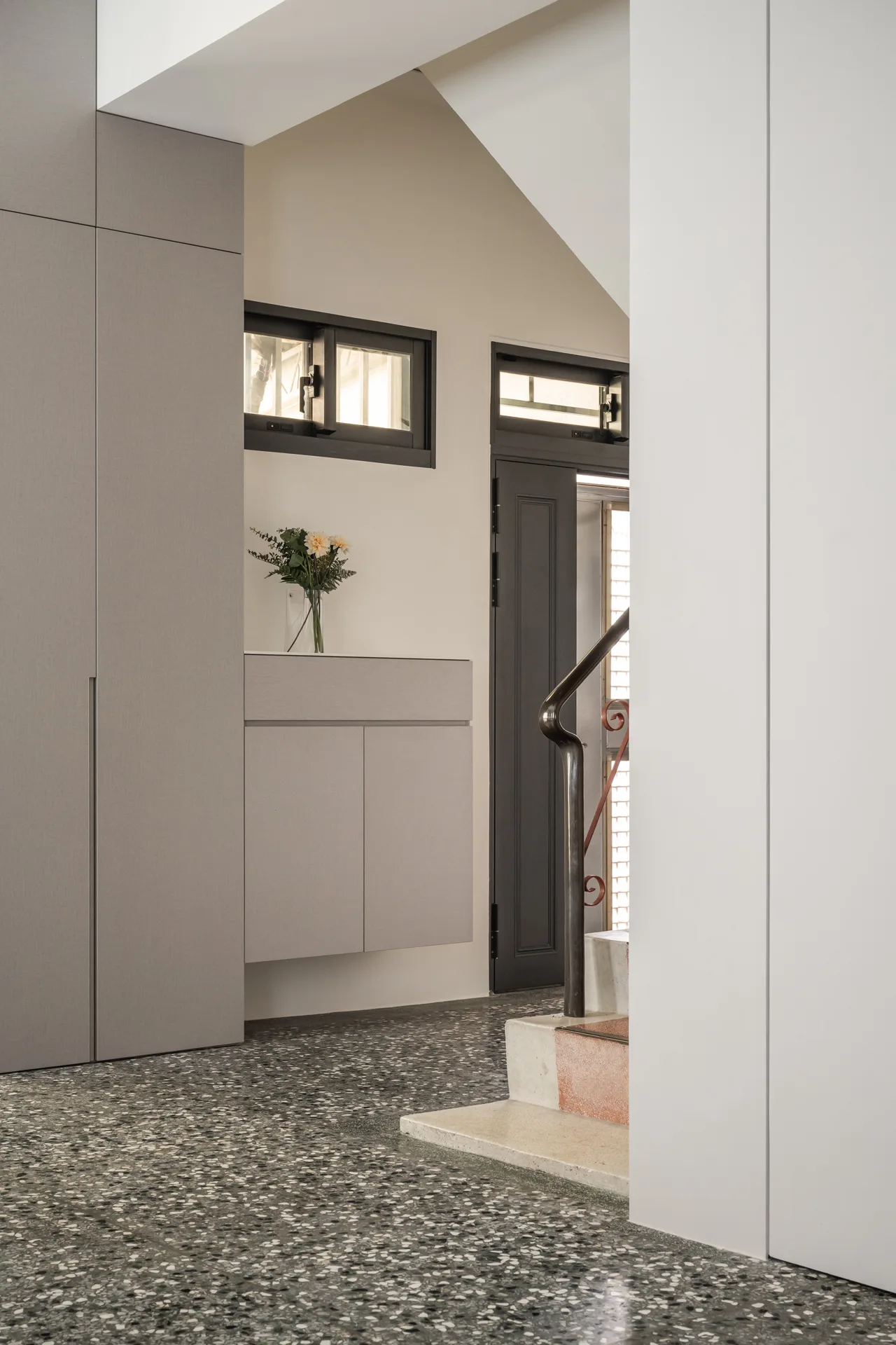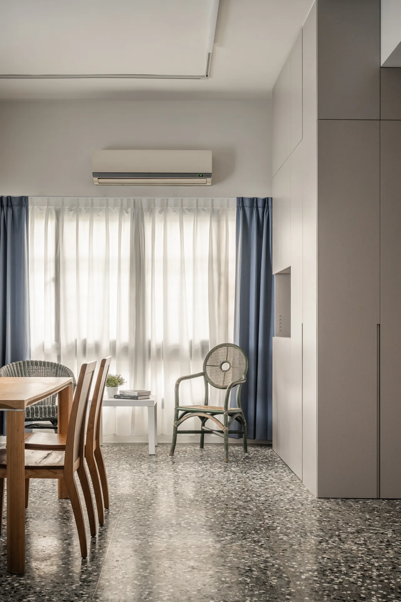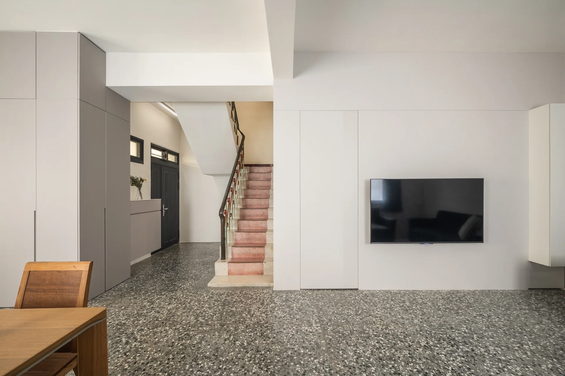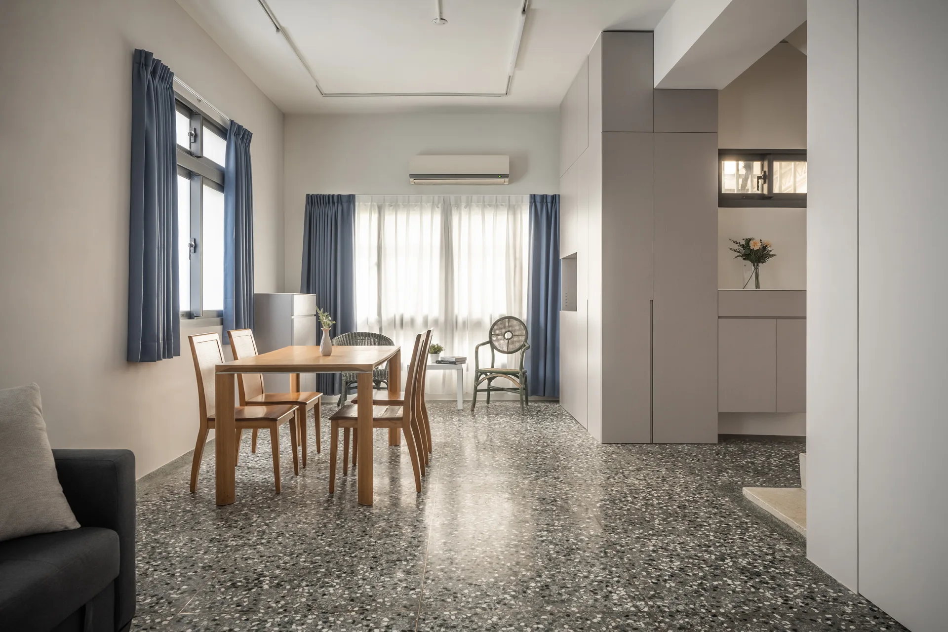 以極簡的線條勾勒收納的秩序,讓每一件物品都能回歸合適的位置,維持流暢的動線,使空間在簡約與實用之間取得平衡。而舊有的磨石子地坪,則經過細緻的打磨拋光,保留歲月的溫度,讓這座老屋在新舊交融間,展現沉靜而優雅的韻味。