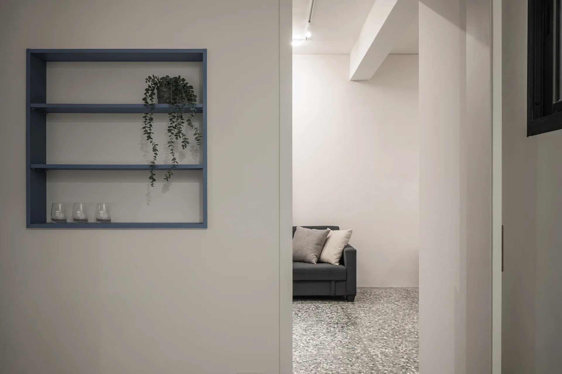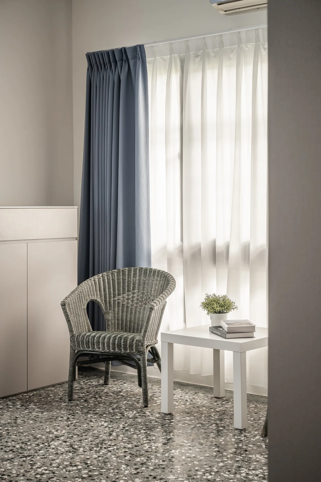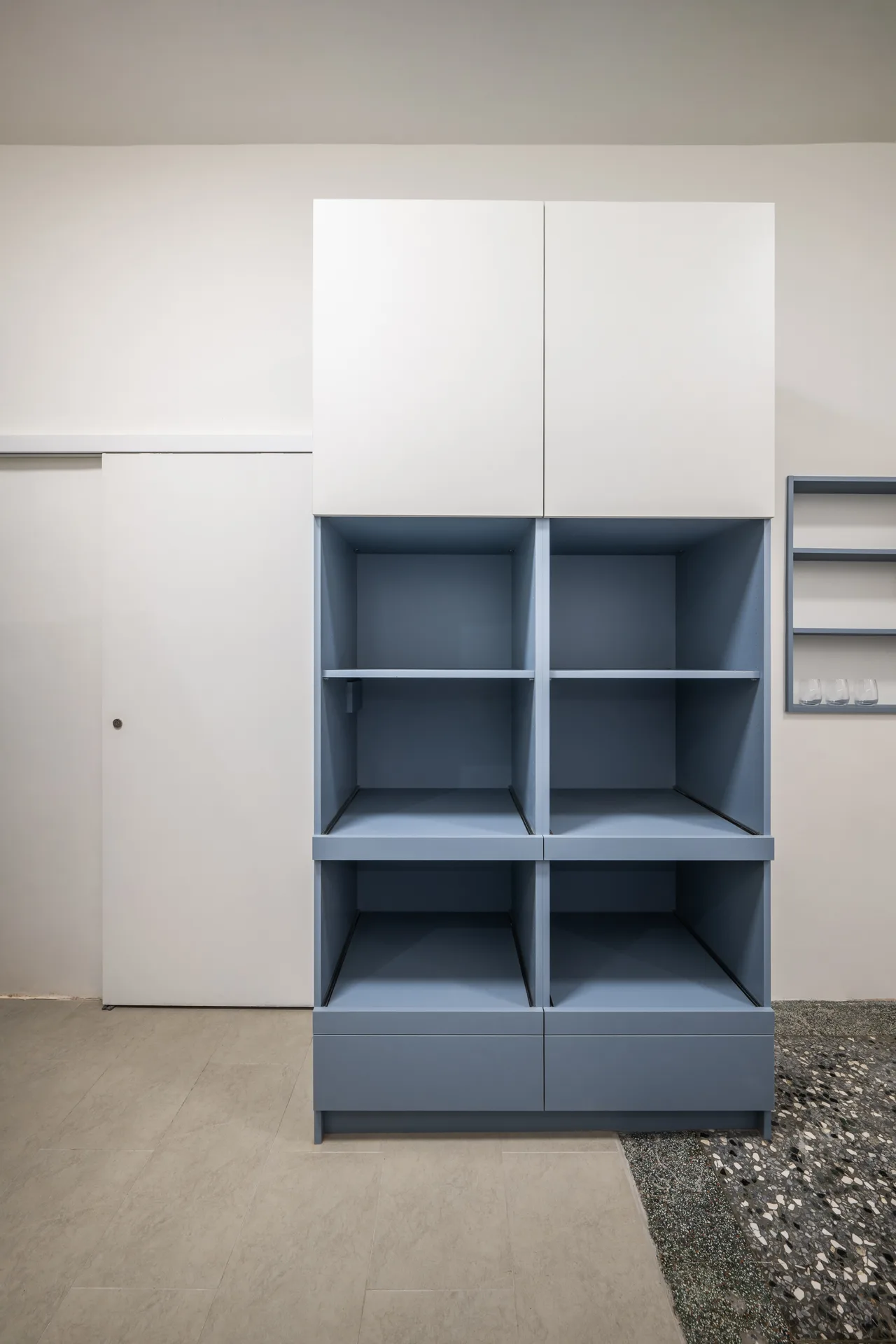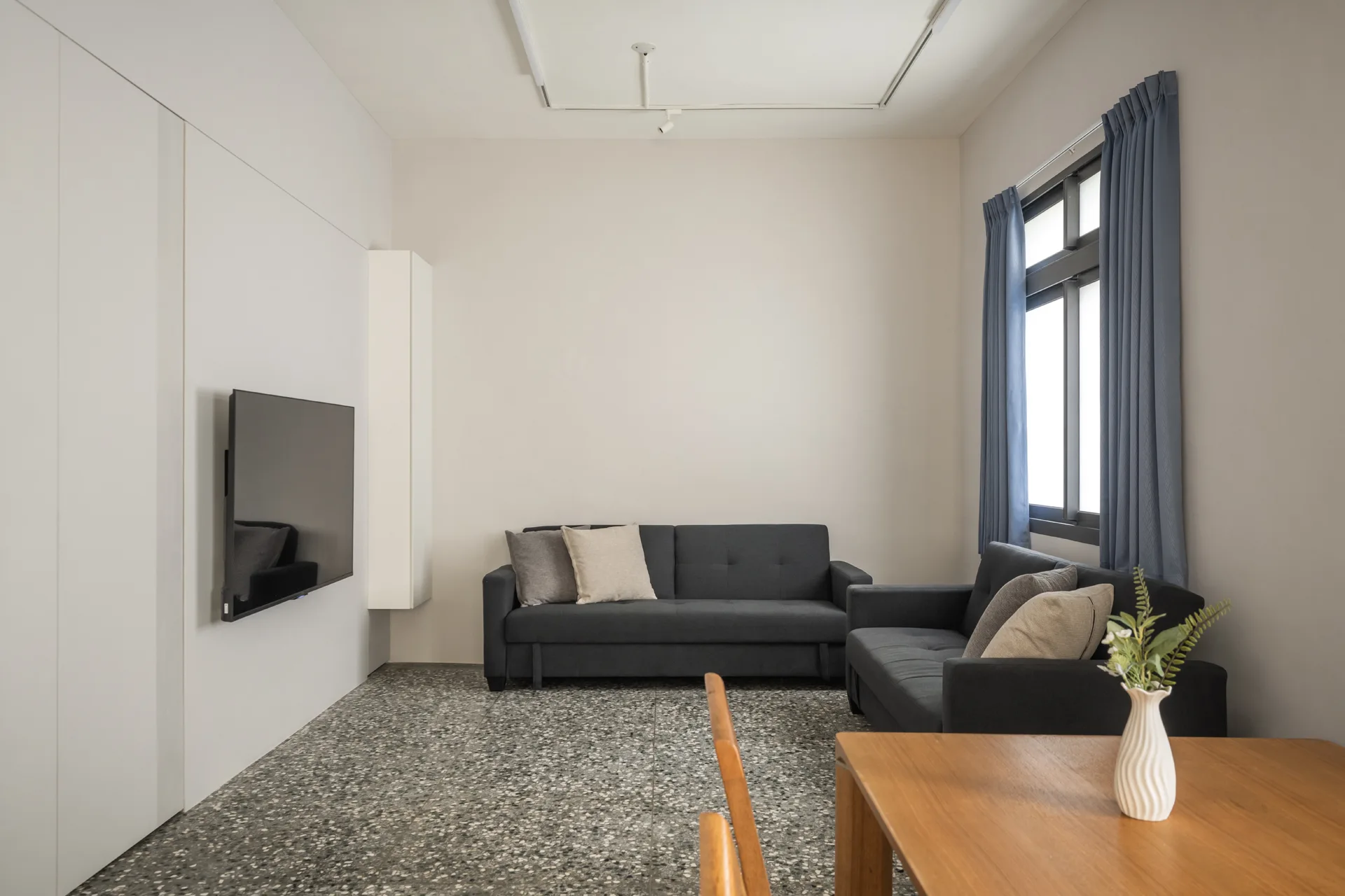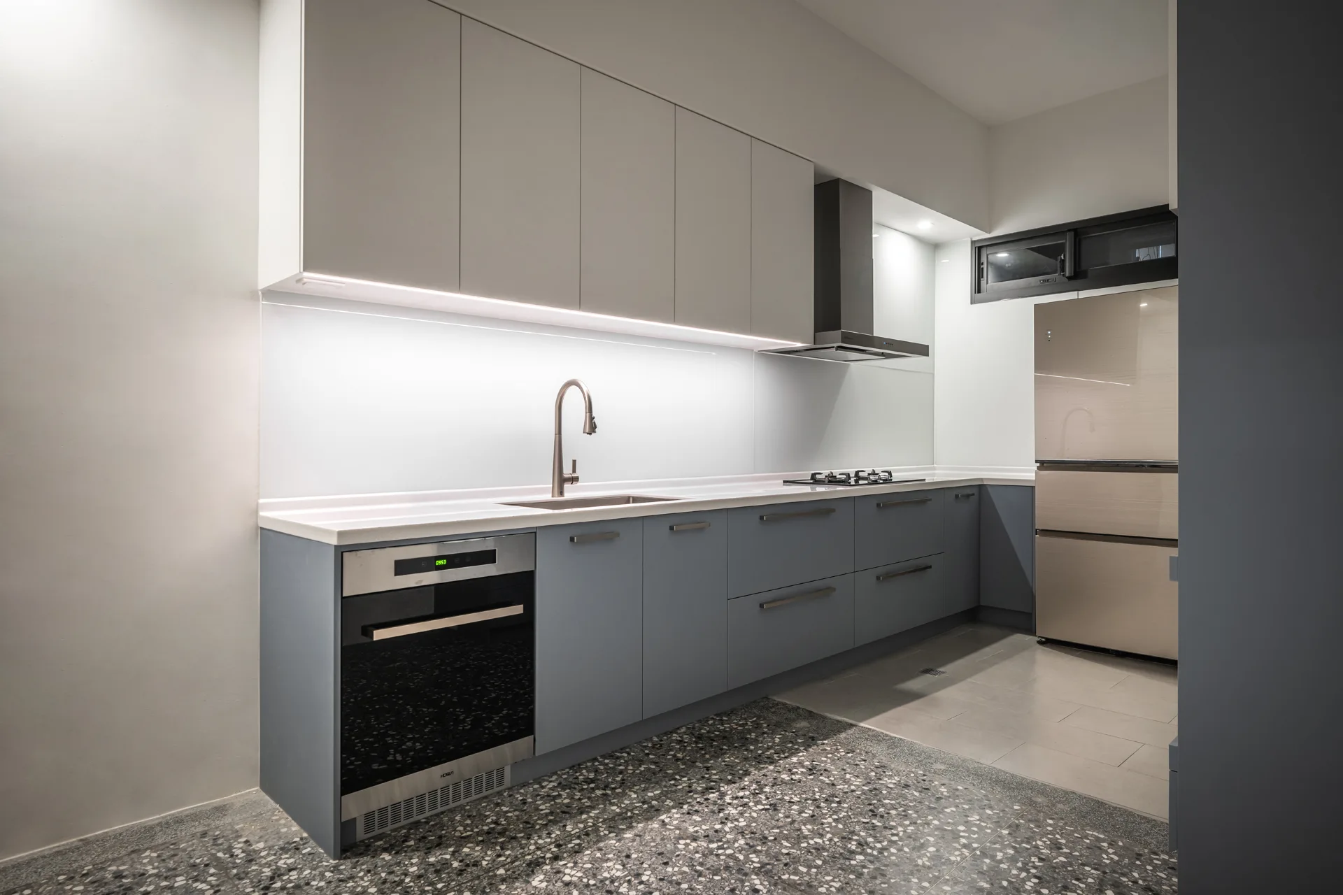 以極簡的線條勾勒收納的秩序,讓每一件物品都能回歸合適的位置,維持流暢的動線,使空間在簡約與實用之間取得平衡。而舊有的磨石子地坪,則經過細緻的打磨拋光,保留歲月的溫度,讓這座老屋在新舊交融間,展現沉靜而優雅的韻味。